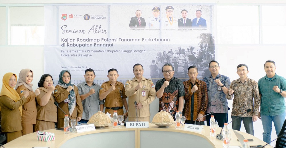 BANGGAI, MERCUSUAR – Pemerintah Kabupaten (Pemkab) Banggai melalui Badan Riset dan Inovasi Daerah (BRIDA) bekerja sama dengan Universitas Brawijaya (UB) Malang, menggelar seminar akhir kajian roadmap potensi perkebunan, di ruang rapat Kantor BRIDA, Selasa (25/11/2025).