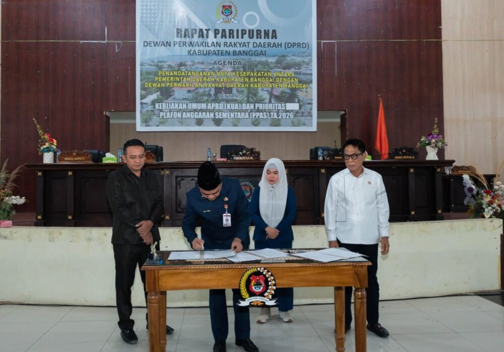 BANGGAI, MERCUSUAR – Pemerintah Kabupaten (Pemkab) Banggai bersama Dewan Perwakilan Rakyat Daerah (DPRD) setempat menyepakati Kebijakan Umum APBD (KUA) dan Prioritas Plafon Anggaran Sementara (PPAS) tahun 2026, melalui penandatanganan bersama nota kesepakatan pada rapat paripurna DPRD Banggai, di Graha Pemda, Luwuk, Jumat (21/11/2025).