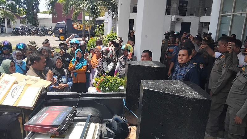 Peserta aksi menyampaikan prites atas kebijakan pemasangan portal parkir di kawasan pasar yang dinilai memberatkan, terutama bagi pelaku usaha kecil dan pengojek. Dalam aksinya, massa menyuarakan keberatan terhadap penarikan retribusi parkir melalui portal tersebut.