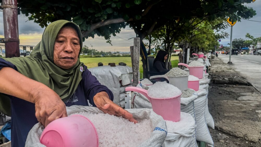 GARAM TALISE – Ina Talise pedagang sekaligus petani garam di Teluk Palu, Provinsi Sulawesi Tengah, menakar garam yang ia hasilkan sendiri untuk dijual. Di balik butiran garam lokal membuktikan ketangguhan perempuan pesisir ikut menopang swasembada garam untuk Indonesia maju. FOTO : KARTINI NAINGGOLAN/MS