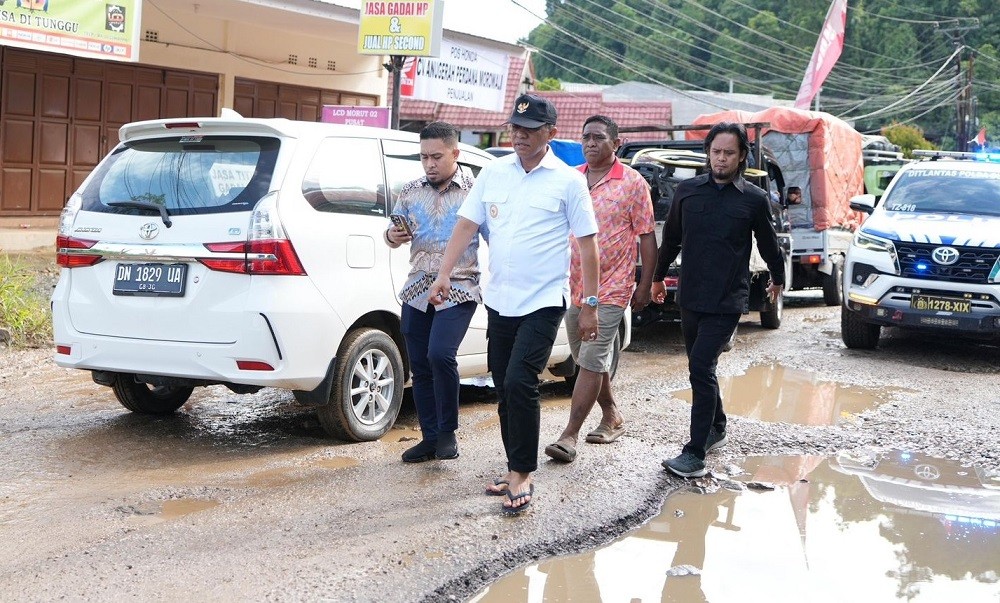 MOROWALI UTARA, MERCUSUAR – Gubernur Sulteng, Anwar Hafid turun langsung meninjau kondisi jalan negara di Poros Tompira–Bungku, Kabupaten Morowali Utara (Morut) yang rusak berat, Kamis (23/10/2025).