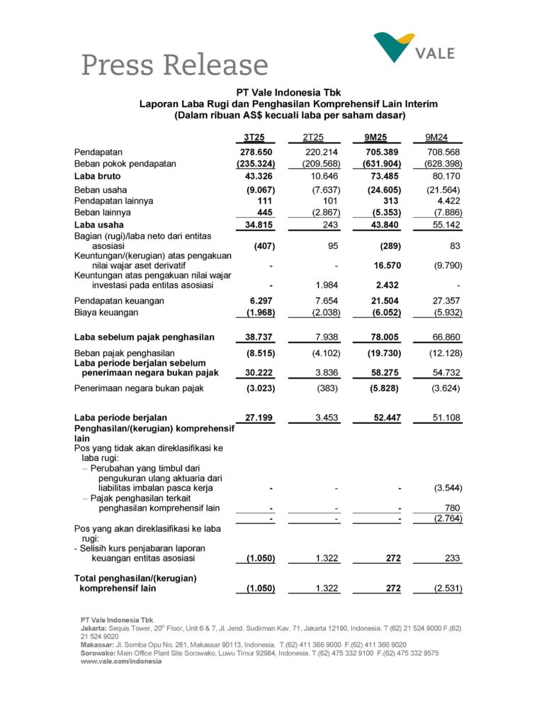 Profitabilitas perseroan juga menunjukkan tren membaik. EBITDA naik signifikan menjadi AS$74,6 juta pada 3T25 dari AS$40 juta pada triwulan sebelumnya. Laba bersih pun meningkat tajam menjadi AS$27,2 juta, jauh di atas capaian AS$3,5 juta pada 2T25. CFO PT Vale, Rizky Putra, menyebut capaian itu sebagai bukti penguatan fundamental bisnis. “Hasil keuangan kami pada triwulan ini menunjukkan peningkatan profitabilitas yang didorong oleh produksi yang lebih tinggi, peningkatan nilai jual nikel, dan pengendalian biaya yang disiplin. Kami juga mulai melihat kontribusi dari penjualan bijih saprolit Bahodopi, yang memperkuat kekuatan portofolio kami yang terdiversifikasi,” ujarnya.