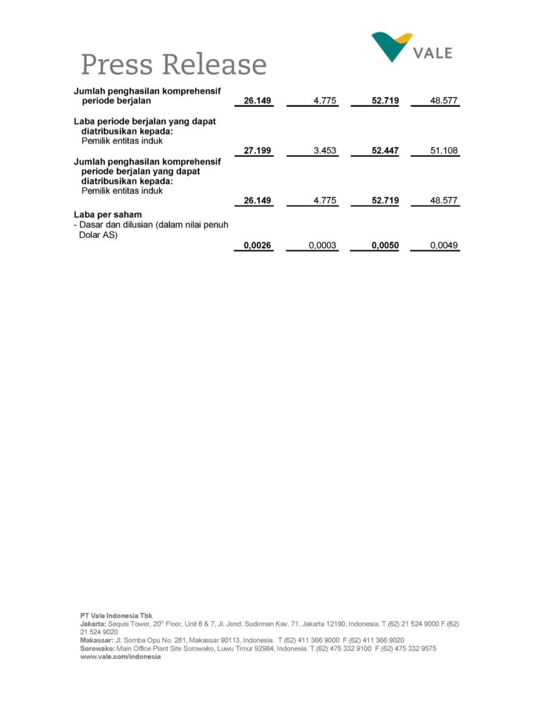 Presiden Direktur dan CEO PT Vale, Bernardus Irmanto, menyebut keberhasilan triwulan ini sebagai hasil dari sinergi tim dan konsistensi eksekusi di seluruh lini operasi. “Kinerja kami mencerminkan dedikasi tim kami dan ketangguhan operasi dalam terus beradaptasi serta memberikan nilai di tengah dinamika pasar. Kami tetap fokus pada keunggulan operasional, keselamatan, dan kontribusi berkelanjutan terhadap pertumbuhan Indonesia,” ujarnya.