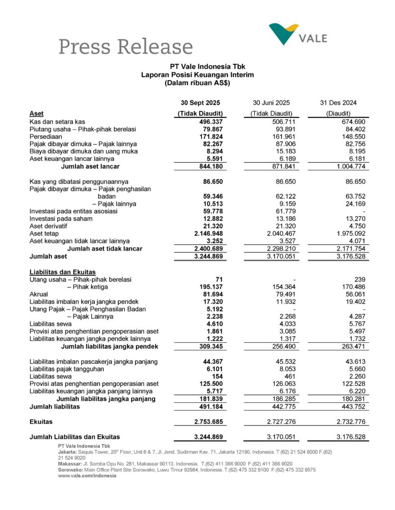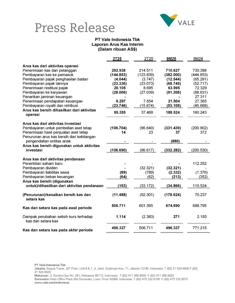 Dari sisi investasi, PT Vale terus mempercepat penyelesaian proyek-proyek strategis. Belanja modal selama 9M25 mencapai AS$331,4 juta, meningkat dari AS$200,9 juta pada periode yang sama tahun lalu. Angka itu mencerminkan percepatan pembangunan proyek Bahodopi dan Pomalaa yang menjadi pilar pertumbuhan jangka panjang perseroan. Adapun posisi kas dan setara kas per 30 September 2025 tercatat AS$496,3 juta.