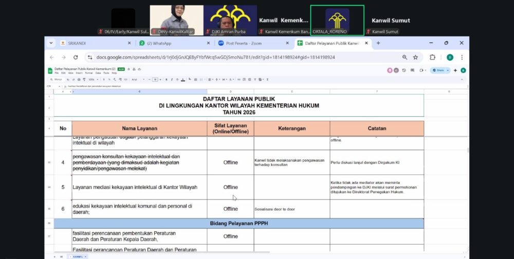 Dalam pembahasan, dilakukan penyamaan persepsi terhadap penamaan dan klasifikasi layanan publik bidang KI guna memastikan keseragaman terminologi dan standar pelayanan di seluruh kantor wilayah Kementerian Hukum. Hasilnya, disepakati lima jenis layanan KI yang dilaksanakan di kantor wilayah, meliputi pelayanan informasi dan konsultasi KI secara offline maupun online, pendampingan pendaftaran dan pencatatan produk KI secara offline, layanan pengaduan pelanggaran KI secara offline dan/atau online, layanan media KI secara offline, serta edukasi KI komunal dan personal yang dilaksanakan di wilayah.