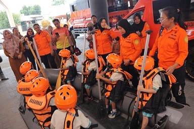 Anak-anak juga diajak mengikuti simulasi sederhana dan pengenalan peralatan SAR air seperti perahu karet, dayung, serta penggunaan pelampung sebagai alat keselamatan di perairan.