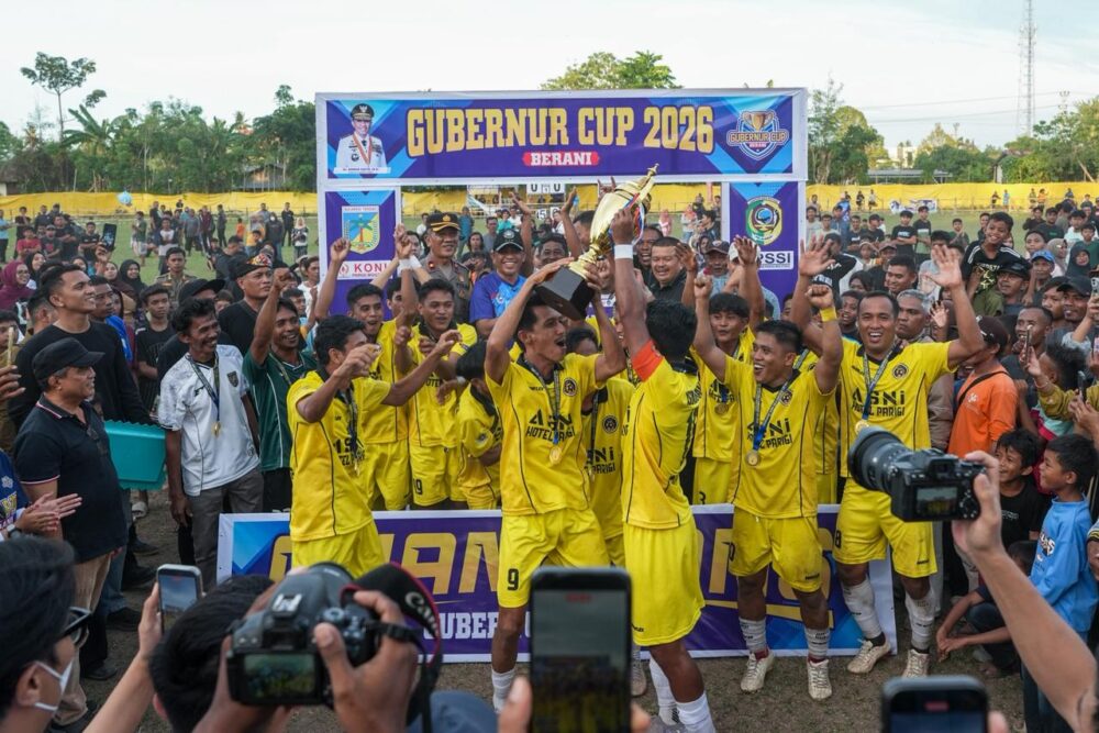 PARIGI MOUTONG, MERCUSUAR – Gubernur Sulteng, Anwar Hafid secara resmi menutup Turnamen Sepak Bola Gubernur Cup Berani 2026, di Lapangan Sepak Bola Patriot Desa Bambalemo, Kecamatan Parigi Kabupaten Parigi Moutong (Parmout), Senin (16/2/2026). Pada turnamen tersebut, tim Isbah Binangga berhasil keluar sebagai juara.
