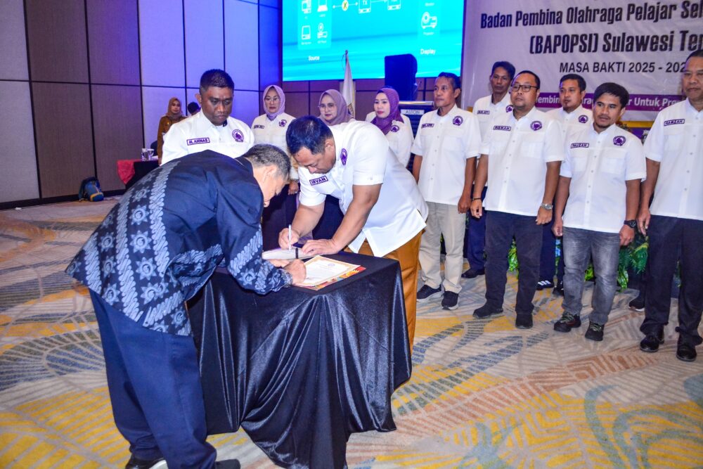 PALU, MERCUSUAR – Wakil Sekjen Bapopsi, Akhyar Matra, resmi melantik Pengurus Provinsi Badan Pembina Olahraga Pelajar Seluruh Indonesia (Bapopsi) Sulawesi Tengah masa bakti 2025–2029 di Hotel Aston Palu, Senin (29/9/2025).