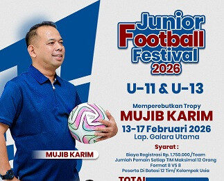 PALU, MERCUSUAR— Komitmen terhadap pembinaan sepak bola usia dini kembali ditegaskan melalui pelaksanaan Junior Football Festival (JFF) 2026 yang akan digelar pada 13–17 Februari 2026 di Lapangan Galara Utama, Kota Palu. Turnamen ini mempertandingkan kelompok usia U-11 dan U-13, sekaligus memperebutkan Trophy Mujib Karim dengan total hadiah Rp25 juta.