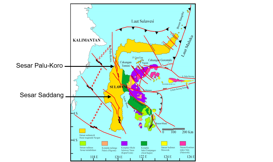Gambar 1 merupakan peta tektonik Pulau Sulawesi. Pada gambar tersebut ditunjukkan sebaran pusat-pusat gempabumi tektonik, berupa zona divergen, zona konvergen (subduksi) dan zona sesar atau patahan. Dua di antara sesar-sesar tersebut adalah Sesar Palu-Koro dan Sesar Saddang.