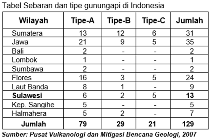 Indonesia memiliki 129 gunungapi, atau 13% dari jumlah gunungapi di seluruh dunia. Dari 129 gunungapi tersebut, 80 diantaranya berbahaya. Sebaran gunungapi di Indonesia ditunjukkan dalam tabel berikut.