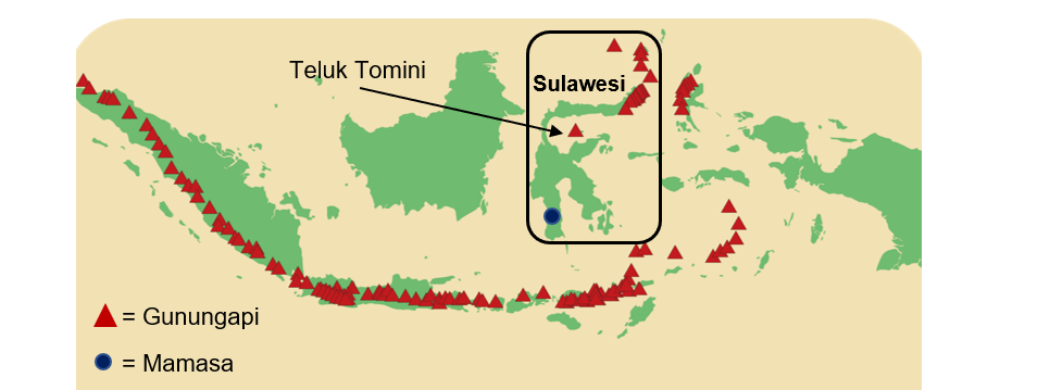 - Tampak dalam Gambar 2 bahwa di Pulau Sulawesi, gunungapi hanya ada di Sulut dan Sulteng. Artinya, di Gorontalo, Sulbar, Sulsel dan Sultra tidak ada gunungapi.