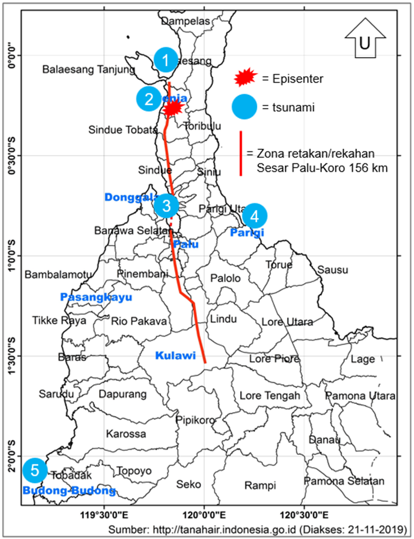 - Gempabumi PADAGIMO Sulteng pada 28 September 2018. Sesar Palu-Koro adalah salah satu sesar paling aktif di dunia yang setiap hari menggetarkan wilayah sekitar jalurnya, di Pulau Sulawesi dan Selat Makassar. Aktivitas sesar tersebut mengakibatkan gempabumi pada 28 September 2018 dengan magnitudo 7,4 (G28S2018M7,4). Gempa tersebut, yang tergolong gempabumi suoershear, memicu 5 jenis bencana geologi sekaligus, salah satunya adalah bencana tsunami. Gambar 2 menunjukkan lokasi episenter G28S2018M7,4 dan 5 perairan yang mengalami tsunami pada saat yang bersamaan, yang dipicu oleh gempa tersebut. Episenter gempa berada di darat, yakni Desa Lende Kec. Sirenja Kab. Donggala. Adapun 5 perairan yang mengalami tsunami adalah: