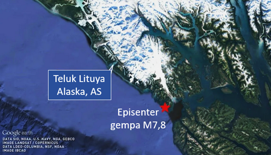 - Gempabumi dan megatsunami Teluk Lituya pada 09 Juli 1958. Gempa tersebut diakibatkan oleh aktivitas Sesar Fairweather, di Alaska begian tenggara (Amerika Serikat). Sesar aktif ini membentang dari Cross Sound hingga Teluk Yakutat, yang juga merupakan batas antara lempeng (raksasa) Amerika Utara dan lempeng (mikro) Yakutat. Ciri umum sesar ini adalah sesar geser yang mirip dengan Sesar Palu-Koro (Indonesia), Sesar San Andreas (Amerika Serikat), dan lain-lain. Gempabumi dengan M7,8 tersebut memicu longsor besar di tebing sekitar Teluk Lituya, yang kemudian membangkitkan megatsunami setinggi 525 m. Tampak pada Gambar 1, lokasi episenter gempa terletak di darat, di sebelah tenggara Teluk Lituya, perairan yang mengalami megatsunami.