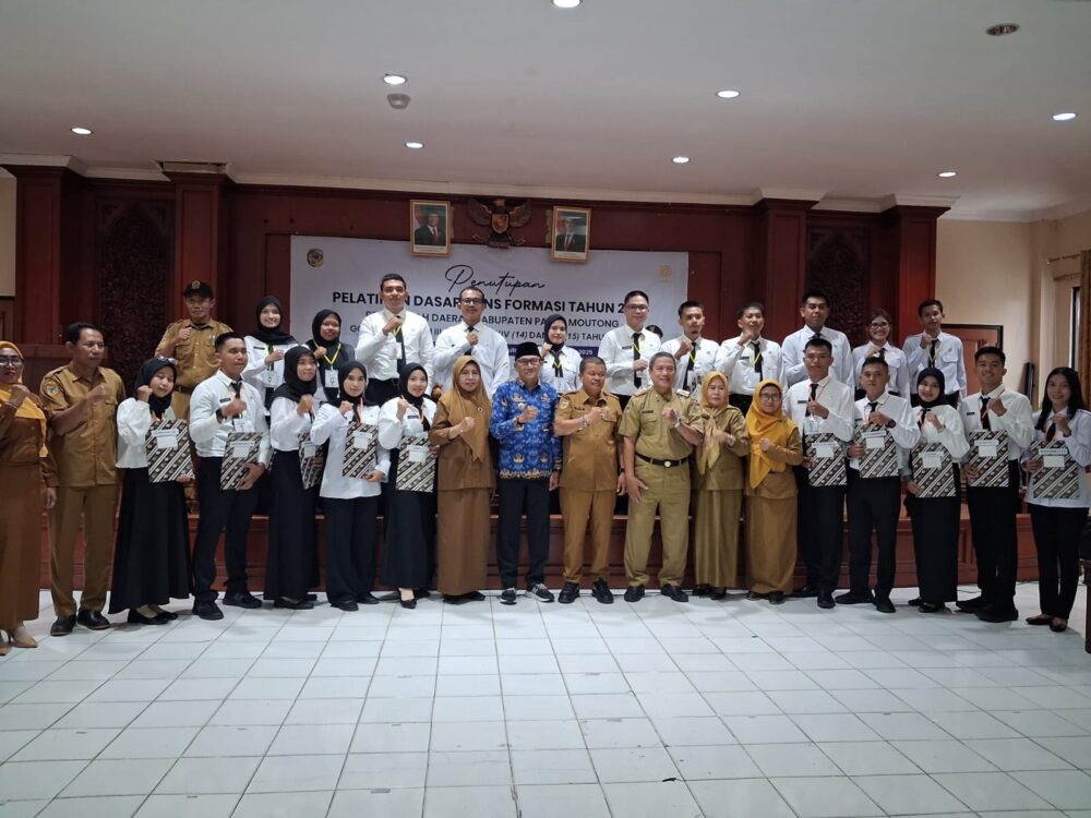 PARIGI MOUTONG, MERCUSUAR – Wakil Bupati (Wabup) Parigi Moutong (Parmout), H. Abdul Sahid menutup Pelatihan Dasar (Latsar) Calon Pegawai Negeri Sipil (CPNS) Formasi Tahun 2024 Golongan II dan III, Angkatan XIV dan XV, di aula Kantor Bupati Parmout, Senin (1/12/2025).
