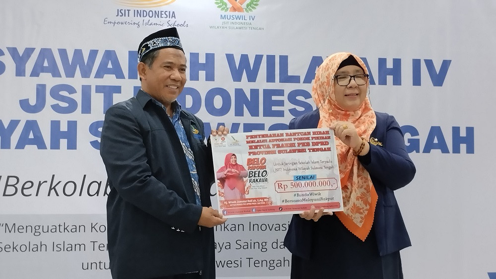 PALU, MERCUSUAR – Ketua Fraksi Partai Keadilan Sejahtera (F-PKS) DPRD Provinsi Sulteng, Hj. Wiwik Jumatul Rofi’ah menyerahkan bantuan hibah sebesar Rp500 juta, melalui advokasi Pokok Pikiran (Pokir) Ketua Fraksi, kepada Jaringan Sekolah Islam Terpadu (JSIT) Indonesia Provinsi Sulteng.