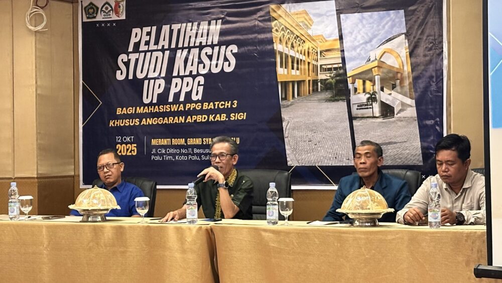 BESUSU TENGAH, MERCUSUAR — Dalam rangka mempersiapkan mahasiswa menghadapi Uji Pengetahuan (UP) Program Profesi Guru (PPG), LPTK PPG Universitas Islam Negeri (UIN) Datokarama Palu menggelar “Pelatihan Studi Kasus UP PPG Batch 3 Kabupaten Sigi (APBD) Tahun 2025”, Minggu (12/10/2025), di Grand Sya Hotel Palu.
