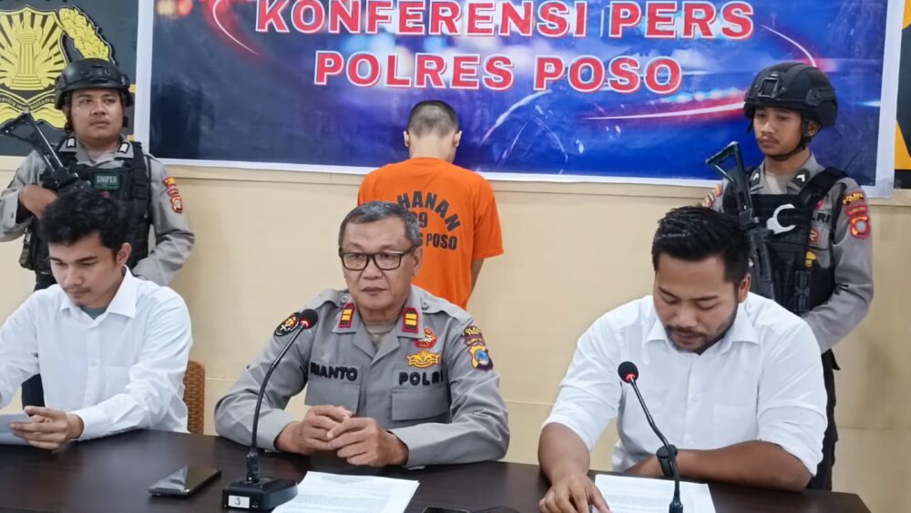 Konferensi pers dipimpin Kasi Humas Polres Poso, Iptu Rianto Hillian, bersama Kasat Reskrim, Iptu I Made Deva Dwi Wiguna didampingi Kanit Pidum, Ipda Xey Xtevarivs.