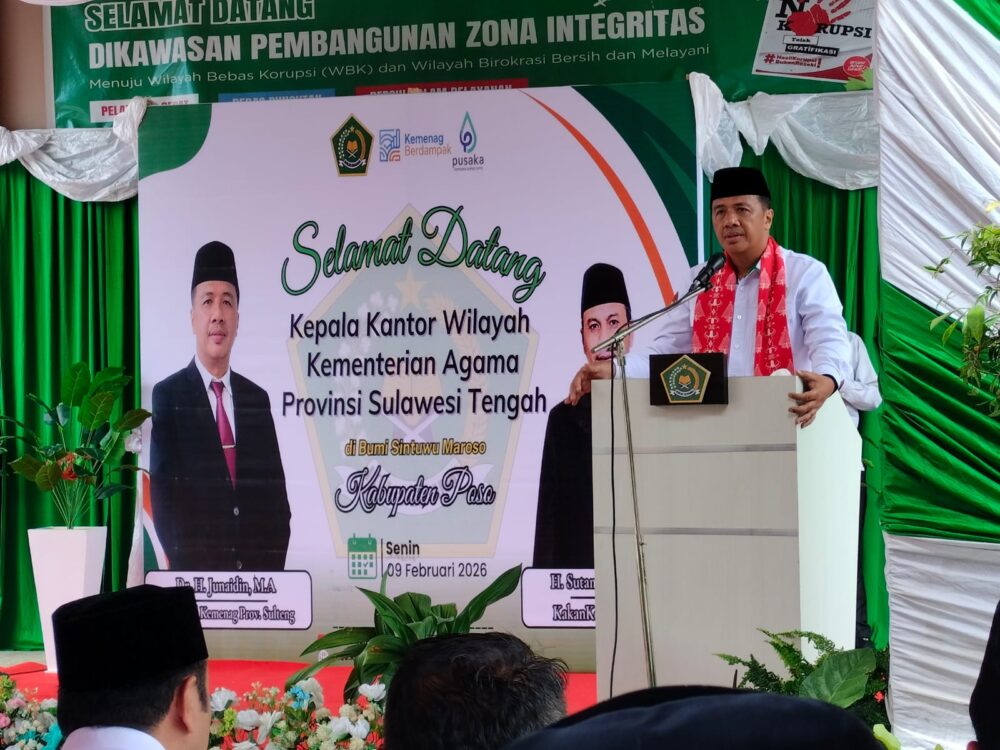 POSO, MERCUSUAR – Kepala Kantor Wilayah (Kakanwil) Kementerian Agama (Kemenag) Provinsi Sulteng, Dr. H. Junaidin melakukan kunjungan kerja sekaligus silaturahmi bersama Pemerintah Kabupaten (Pemkab) Poso, jajaran ASN Kemenag, serta Organisasi Kemasyarakatan (Ormas) Keagamaan Kabupaten Poso, di halaman Kantor Kemenag Kabupaten Poso, Senin (9/2/2026).