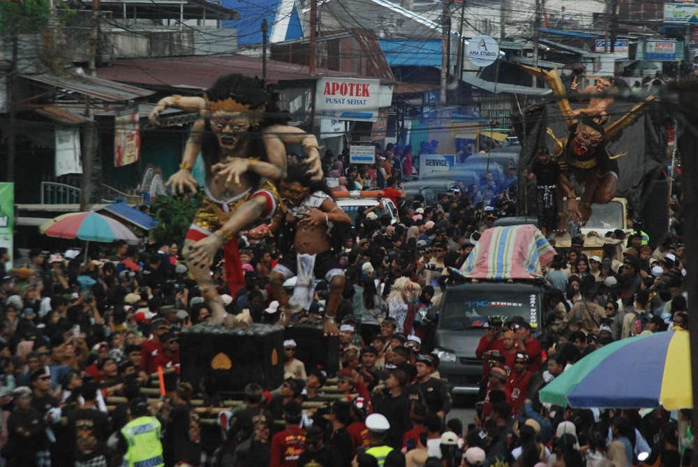 “Ogoh-ogoh yang diarak ini berasal dari 10 adat yang ada di Pura Purnasadha Tolai, dilepas usai umat Islam menjalankan salat asar,” ujar Dewa Putu Suka.
