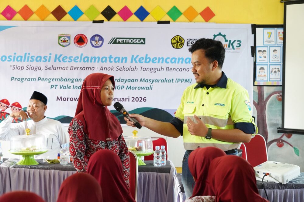 Community Development Officer Bahodopi PT Vale, Salwa menyampaikan bahwa edukasi kebencanaan merupakan bagian dari komitmen perusahaan terhadap keselamatan dan ketangguhan masyarakat di sekitar wilayah operasional.