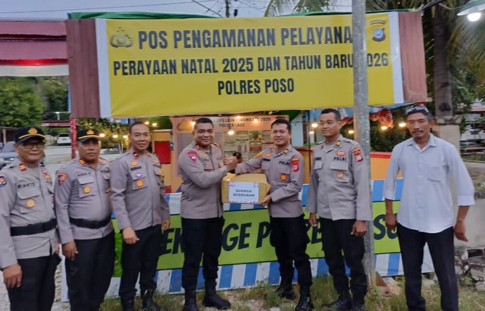 POSO, MERCUSUAR – Kapolres Poso, AKBP Alowisius Londar melaksanakan pemantauan kesiapan petugas, sekaligus memberikan bingkisan kepada personel yang bertugas dalam pengamanan dan pelayanan di Pos Pengamanan Natal dan Tahun Baru (Nataru), Senin (22/12/2025).