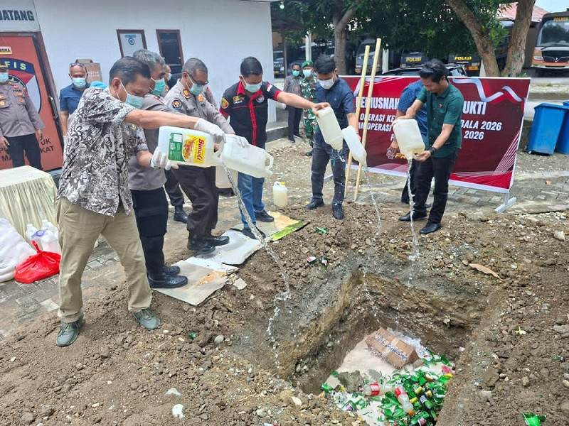 Barang bukti yang dimusnahkan berupa minuman keras (miras) jenis cap tikus masing-masing 586 kantong plastik, 18 jerigen ukuran 5 liter, dan 47 botol air mineral. Selain itu, 213 botol miras berbagai merek, satu kardus petasan berbagai jenis dan merek, serta 36 buah knalpot bogar.